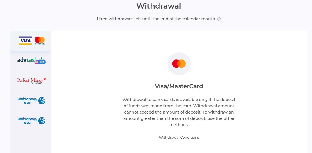 Fund withdrawal to Credit or Debit Cards are available if the deposit of funds were made from the same card. The withdrawals to the card cannot exceed the deposited amount. Any additional amount beyond deposited money can be withdrawn using other methods like Bitcoin, WebMoney, and AdvCash.